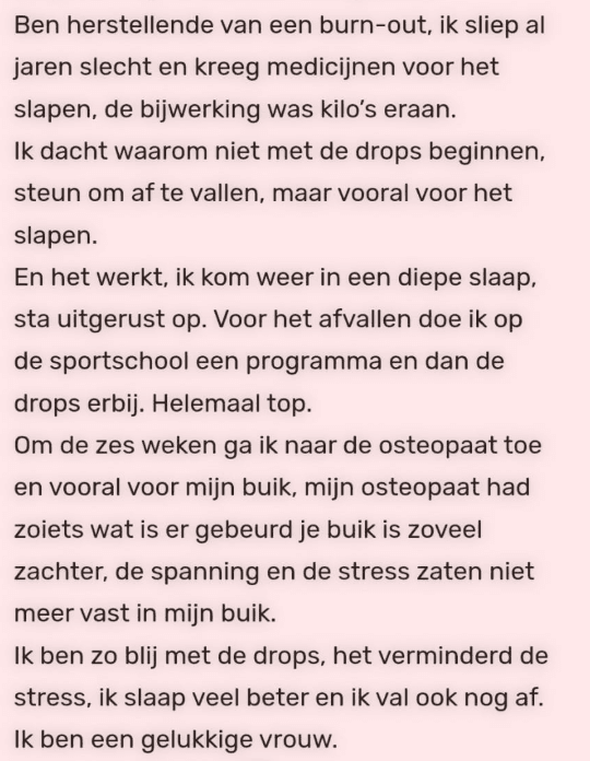 Ik snap je twijfel heel goed. Veel mensen die de drops gebruiken, hadden ook al van alles geprobeerd zonder blijvend resultaat. Het verschil zit hierin: de drops ondersteunen niet alleen je hoofd, maar juist ook je lichaam en zenuwstelsel. Want na narcistisch misbruik zit stress vaak letterlijk vast in je lijf. Overdag geven de drops je energie en focus, ’s avonds zorgen ze voor rust en diepere slaap. Daardoor heb je meer balans en grip op je keuzes, zonder dat je er veel extra voor hoeft te doen.